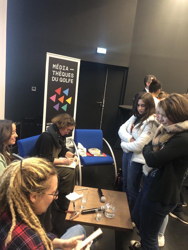 Dans le cadre de l’atelier littéraire du jeudi midi, 14 élèves de la seconde à la terminale se sont rendus ce matin avecXavière Groyer, documentaliste et François, stagiaire au CDI au Palais des Arts pour participer à une rencontre littéraire pour le prix jeunes adultes de Vannes. Ils ont pu échanger avec 3 auteurs : Sophie Adriensen ( Hacker) Silène Edgard ( Une maison de feu) et Margot Dessenne (Absolu) ils ont pu poser leurs questions. 2 autres lycées étaient aussi présents. Ce fut une rencontre et un échange riche et très intéressant. Retrouvez les livres au CDI .