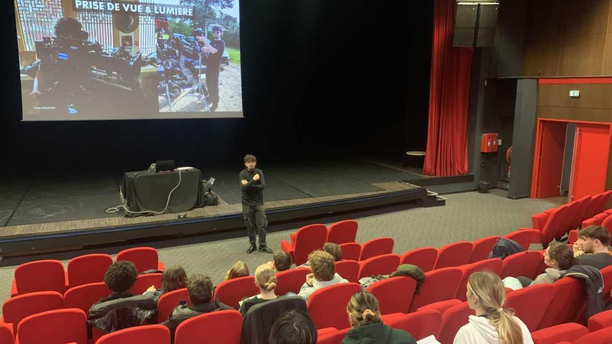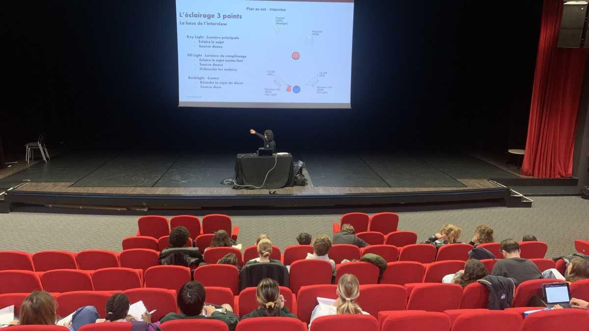 Théo Maugain, ancien élève de la SPÉ CiAV, est intervenu à l’amphi sur 2 sessions « IMAGE » : prise de vue et éclairage au cinéma. La première a consisté en un rappel théorique sur l’optique et les paramètres que son l’exposition, la mise au point, la sensibilité du capteur, la profondeur de champ, la « focale », la fréquence d’obturation… La seconde a permis d’ouvrir sur un TP composé d’exercices pratique d’éclairage d’une scène. Les élèves ont ensuite bénéficié d’une formation à la prise de son avec Cédric Le Ru et d’une séance ACTING avec Caroline Créach.