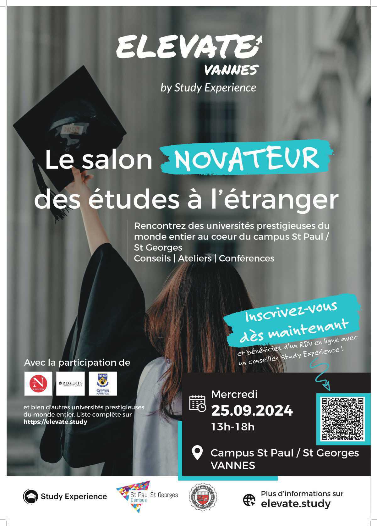 Le Campus St Paul St Georges et le Lycée Saint François-Xavier de Vannes organisent en partenariat avec STUDY EXPERIENCE, la deuxième édition du Salon « ELEVATE – Etudier à l’étranger » à Vannes le mercredi 25 septembre prochain (Campus St Paul St Georges).