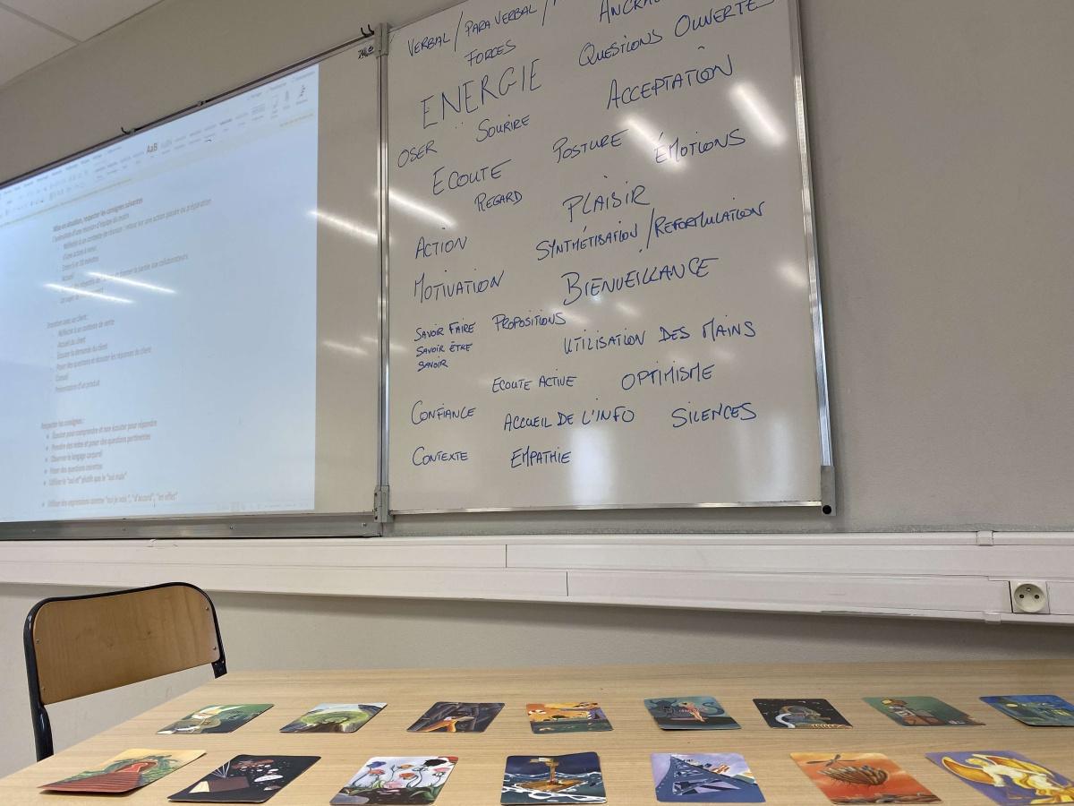 Au travers de diverses activités (jeux de cartes, brainstorming, exercices de posture, mises en situation concrètes comme un briefing matinal et un entretien avec un client), M. Loyer a aidé les étudiants à faire leur portrait de compétences (quels sont les soft skills nécessaires pour un manager commercial opérationnel? Que dois-je mettre en oeuvre pour obtenir mon diplôme?) et à identifier les savoir-être attendus en entreprise (ponctualité, politesse, tenue ...).