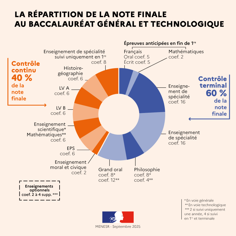 Épreuves écrites et orales: 60 % (1er enseignement de spécialité : 16 % ; 2nd enseignement de spécialité : 16 % ; grand oral : 12 % en voie technologique et 8% en voie générale ; philosophie : 4 % en voie technologique ou 8 % en voie générale ; français en première : 10 %)
