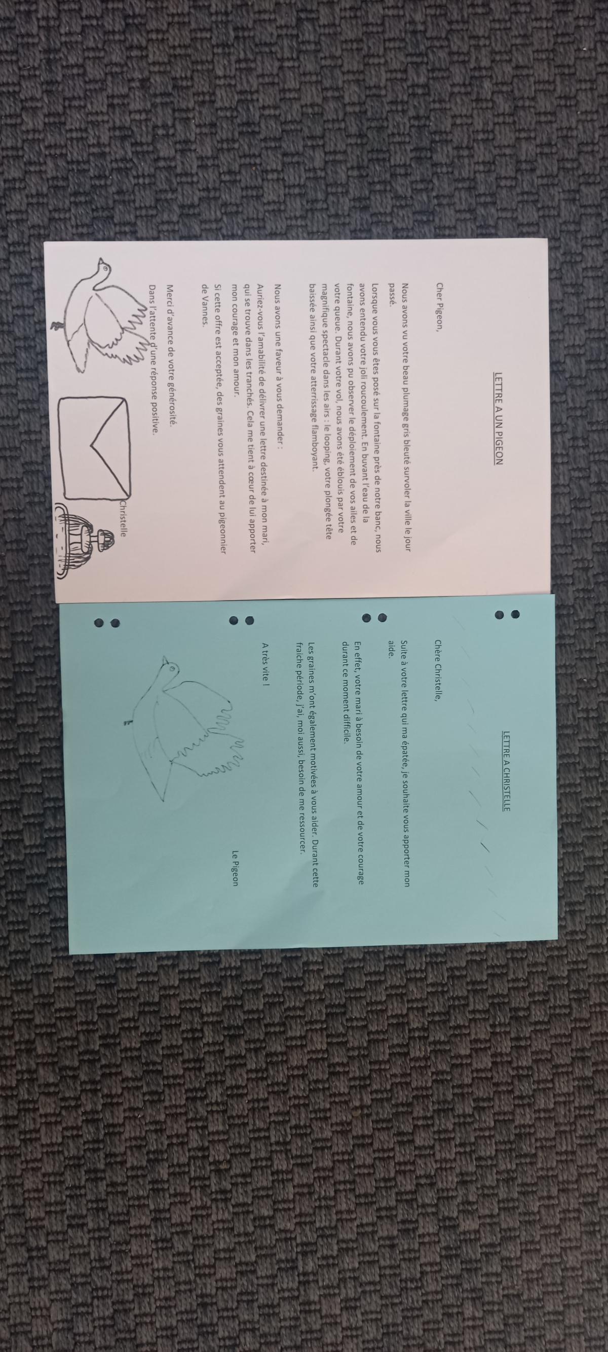 Aux élèves d’établir un courrier illustré à la main, mettant en avant une situation impossible, rêvée ou hors norme : un courrier et sa réponse. L'enthousiasme et la mise à la tâche furent un joli succès : développement ou découverte de la fantaisie, de la créativité, de l’humour et de la finesse. Monsieur Maruenda, Isabelle Baete et Anne Cécile Guillaume furent conviés à la remise du livre broché.